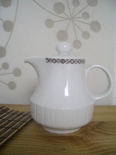 デンマークで見つけました。こちらは旧東ドイツのメーカーのCORDITZの、小さな柄がなんともかわいらしいミニポットです。キッチンで1杯カップにお茶を入れて、このポットには2杯目を・・・。何度もお店に足を運んで、手に取っては置いて帰ってたのですが、やっぱりこのつまみや縁取りに使われている小さなデザインが可愛すぎて、遂に購入して来ました!お料理のたれやソースを入れてテーブルに出してもいいですね! ★製造時からの小さな気泡の跡のようなものが2箇所見られますが、気にならない程度です。欠け、ヒビはありません。