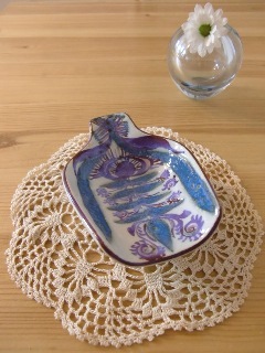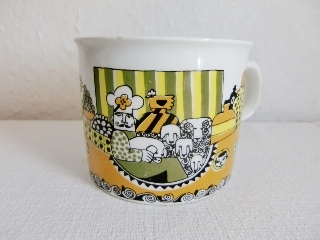 FiggjoのTuri-Designの大きなマグのご紹介です!コレはマグと言っていいのか、とにかく大きな作品です。タイトルは「Mitt skibe er lastet med…………………….」。日本語で言うと「僕の船に積まれているのは・・・・・・・・」と言ったところでしょうか。コックさんが彼の食材と一緒に船に乗っているイラストですね。小麦粉や新鮮な果物、野菜、お肉など等・・・一体どんなお料理になるのでしょうね!たっぷりのスープや、一人分のシチューなどを入れて寒い冬に大活躍しそうです! ★リムやハンドルのところが釉薬がはがれて茶色くなっているところや小さなペイントロスがありますが、欠けやヒビはありません。