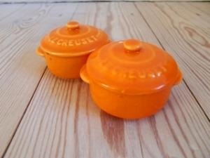 とってもかわいいキッチン用品発見です!!!こちらはル・クルーゼのお鍋型のソルト&ペッパーシェイカーなんです!!かわいいオレンジ色で、キッチンやテーブルにポップな色のポイントを入れてくれます! ルクルーゼのお鍋のミニチュアなんて、そのまま飾っておくだけでもとってもCUTEです♪ジャグの形のものは見かけますが、お鍋の形は珍しいと思いませんか? 早い者勝ちですので、悩んでいる方はどうぞお早めに!!★ボディーに焼いたときの貫入らしきものがうっすらと入っています。よく見えない上、ご使用には支障ないと思われますが