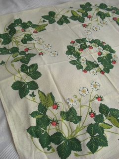 スウェーデンで見つけました。生成りっぽい色の生地にカワイイ野いちごと、そのお花がプリントされているとっても春らしいクロスです。少し小さめなので、テーブルのアクセントとして使っていただけます。もちろん低めのクローゼットや靴箱の上に飾っても、玄関を可愛く明るくしてくれそうです♪ ★ほつれや破れはなく、きれいなコンデションです。(コットン100%)