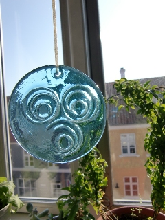 デンマークで見つけました。以前完売になったオレンジ色と同じ模様の物です。こちらはとっても、本当にキレイな水色のサンキャッチャー。オイシソウです・・・笑。ぶら下げて光に透かすと白い壁にキレイに、水のようにブルーが反射します。光に透かさなくても、白い壁に掛けるだけでもとてもキレイです♪少しいびつで手作り感たっぷりのサンキャッチャー、おすすめです。★空気が入っている部分がありますがそれも愛嬌の1つとしてお楽しみください。欠け、ヒビはありません。