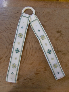 デンマークで見つけました。久しぶりのトレーハンガーです!こちらは2色のグリーンの色使いがとてもかわいらしい刺繍のもの。北欧っぽさたっぷりのパターンで、素朴で温かみがありますね!いつも立てかけてあるお盆(トレー)、このトレーハンガーでちゃんと飾ってあげませんか? ★1本の裏側に少しほつれがあります(写真)がご使用には差し支えありません。