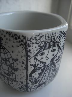 デンマークのアンティークショップで見つけました。 とってもかわいい6角形のペン立てです。かわいいコップかと思ったんですがショップの人が「ペン立てだと思うんだけど・・」とおっしゃってました。6面のうち3面に3人の女の子が描かれています。一緒に描かれている鳥かごもステキ★ もちろん何を入れてもOKです。小さなサボテンや切り花を入れてもステキです! ★とても小さなプリントのズレが1箇所ありますが、欠けはありません。 USEDなのにとてもいいコンディションです!