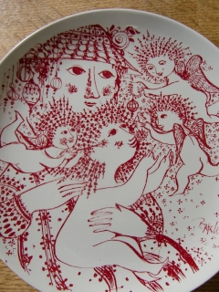 ビョーンウィンブラッドの珍しいNymolleのクリスマスプレートです★これは彼の頭の中での「ジーザスを抱くマリア」なのでしょうか?赤ん坊にキラキラ輝く天使たちが祝福に舞い降りています。彼の独特のタッチと想像力が見事にマッチした1枚ですね!裏にはJulen1961(クリスマス1961)と書かれています。
