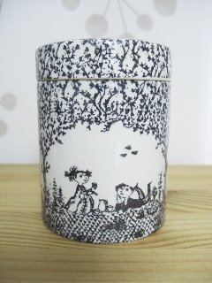 デンマークで見つけました。ビョーンウィンブラッドの筒状のケースになります。こちら、デンマークのネットサイトで見かけたことはあったのですがその時はふた無しで売られていました。実際にフタがあって、キレイなコンディションのものに出会えたので、コレを見つけたときはうれしかったです★何に使うのかなんて全く考えずに飛びついて買ったのですが、描かれているイラストを見ているとどれも素敵なティータイム・・・と言う事はお茶の葉を入れたり、お茶と楽しむ小さなお菓子、又はお砂糖などを入れるものかな? と思ったりしています。もちろん使い方は自由。お好きなように、お使いくださいね! ★欠け、ヒビもなくきれいなコンディションです。