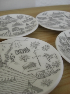 デンマークで見つけました。Rorstrandの4都市をかわいいイラストで描いたミニトレイです。都市は「MALMO」「STOCKHOLM」「LEKSAND」「GOTEBORG」です。それぞれの都市の有名どころや物が描かれていてとにかくCUTE! LEKSANDにはダーラナホースやGOTHENBURGにはやっぱり貿易のSHIPなど・・・こまごまとして、雑貨好きの人にはたまらないセットです!裏には、糸などを通して掛けられる様に小さな穴が開いています。マークもかわいい!!4枚並べて飾ってください!★欠けやヒビはありません。