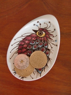 デンマークで見つけました。Beth Breyenデザインの豆皿です。こちらは彼女の作品の中でも大人気の小鳥の絵のものです。そして、ロイヤルコペンハーゲンではなく ALUMINIA!この豆皿は4色あるのですが、こちらは赤紫色の体に水色の羽の子になります。以前3色セットが完売になったのですが、1つずつ集めてみるのも楽しいかもしれませんね。お手ごろ価格です!★表面にはどうしても避けられない小さなスクラッチはありますが、欠け、ヒビもなくキレイなコンディションです