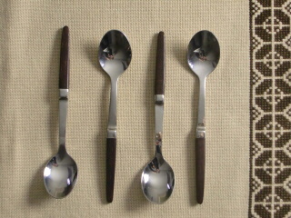 デンマークの王室御用達RAADVADのローズウッドハンドルのティースプーンセットのご紹介です。何気ないフォルム、でもやっぱりどこか洗練された雰囲気を持っていますね。裏の王冠のロゴと滑らかなローズウッドの手触りでちょっとした王室気分に?! ★使われていたものですので、使用感はありますがきれいな状態です。