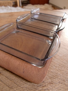 チークとガラスがとってもマッチしているトレーのセットです。スモーキーカラーのガラスがゴージャス感与えてくれます。これはどうやって使うのかな?オードブルを乗せて・・・?と思って、お店の方に聞くとどうやらデンマークでよく食べられるオープンサンドの具を入れて使うようです。特にニシン。酢漬けやクリーム和え、それにピクルスなど・・・。そしてテーブルにおいてみんなでとって食べるそうです。セルフサンドのランチの時はいいアイデアかも!でもナッツやチョコ、ビスケットを入れたり、クラッカーとディッップ、スティックベジタブルを乗せておつまみトレーにもステキです!チークトレーの両サイドは、テーブルから取り上げやすいように底から上がったフォルムになっています。
